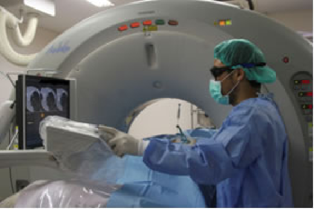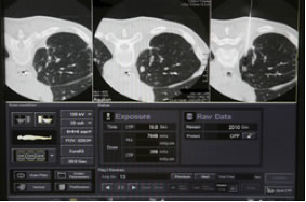 写真の解説:我々は最先端の技術が搭載されたIVR-CTを駆使し、モニター上に映し出されるCT画像を見ながら極めて正確に腫瘍にラジオ波治療用の針を穿刺することができます。
