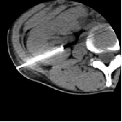 患者様にはまずCT台の上に仰向けもしくはうつぶせで寝ていただきます。治療最先端技術が網羅されたIVR-CT装置を駆使し、CT画像を観察しながらまずドリルで骨に穴を開けます。次に穴の中に電極針を進め、病変に刺入します。その後、腫瘍の焼灼を行います。治療時間は、治療する大きさにより様々ではありますが、2-3時間程度で終わることがほとんどです。