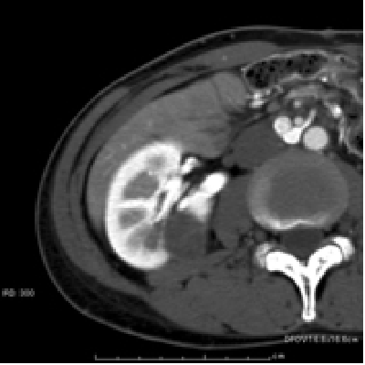 腎がんが多発するフォンヒッペルリンドウ病の患者様で、左腎はすでに他院で摘出されており、右腎しかない単腎の症例。ラジオ波治療後に腫瘍は完全に死滅している。この患者様はこの後、もう一つ別にあった腎がんも同様に治療された。このようにラジオ波治療は腎機能を低下させず、繰り返して治療できることから、このような単腎の多発腎がんでも治療が可能である。